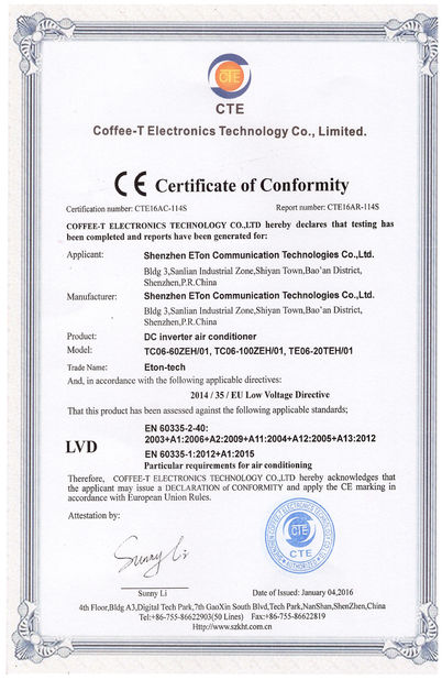 Standard:CE Numero:CTE16AR-114S Data tecnico Problema:2016-01-04 Ambito di applicazione / Gamma:Industrial DC air conditioner(LVD) Rilasciato da:CTE |
