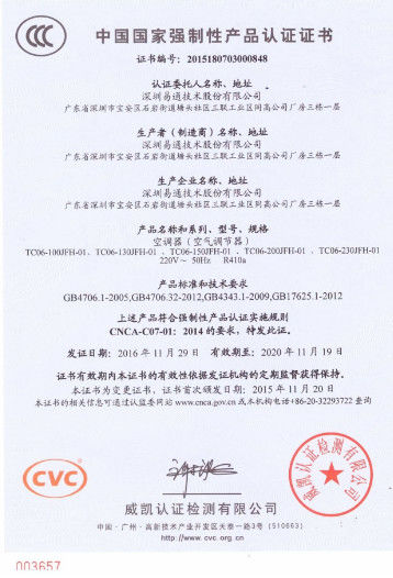 Standard:3C Numero:2015180703000848 Data tecnico Problema:2016-11-29 Data di scadenza:2020-11-19 Ambito di applicazione / Gamma:Air conditioner Rilasciato da:CVC |